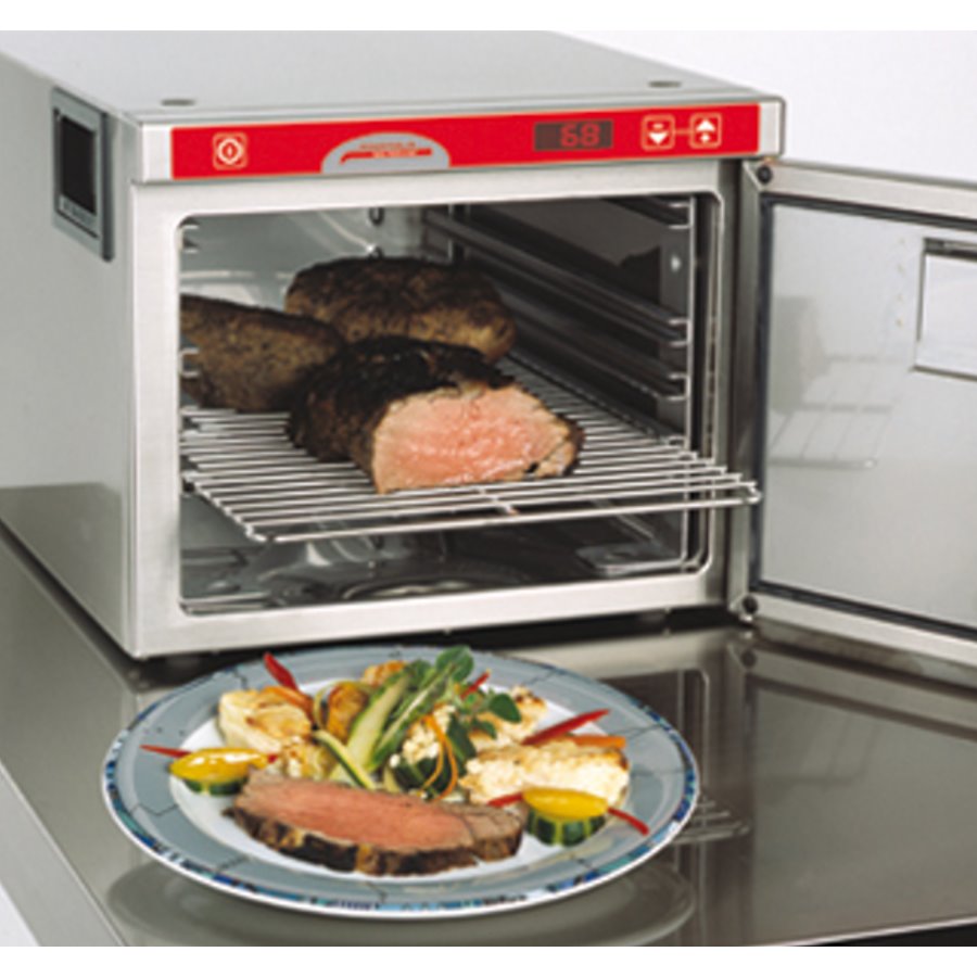 Capacité: 3 glissières pour GN 1/1-65 Modèle de table / murale / encastrable à chaleur statique pour maintenir au chaud, viande, poisson, garniture, etc. Ainsi que pour la cuisson à basse température (Cook&Hold). Capacité pour max. 3x GN 1/1-65 ou 2x GN 1/1-100 Equipement: Syatème par chaleur statique pour une cuisson lente, sans ventilation. Contrôle exact de la température grâce à la sonde PT 500 et software à +/- 2°C. Niveau de température réglable de 50-120°C. Réglage rapide pour une température optimale à 68°C, affichage digitale. Système de désumidification pour les mets panés. Commande électrinique avec touches tactiles et affichage digitale. Appareil prêt à brancher, inclus fiche et cable. Exécution: 1 porte avec aération Intérieur et extérieur de l’etuve en inox 18/9, porte avec fermeture magnétique. Intérieur étanche selon les normes d’hygiene. Fond de récupération des liquides pour 3 dl. 2 consoles latérales avec 4 paires des glissières pour GN 1/1, amovible. Etuve et porte à double paroie hautement isolée. Poignée latérale intégrée pour transort facile. Poignée de porte facilement réversible. Grandeur: l x p x h: 415 x 675 x 343 Poids: net 24 kg Norme: CE Accessoires: Fiche et cable électrique Sans plaque et grille GN Raccordement électrique: 1.0 kW, 230V, 10A