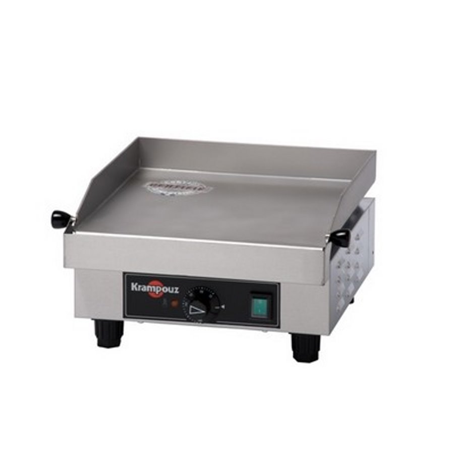 Plancha électrique petit modèle Krampouz 230 volt 1600W Plaque de cuisson en acier inox de 340x340 mm thermostats réglables de 50 à 300°C Bac amovible de récupération Dim: 395 x 380 x195 mm Garantie 1 année